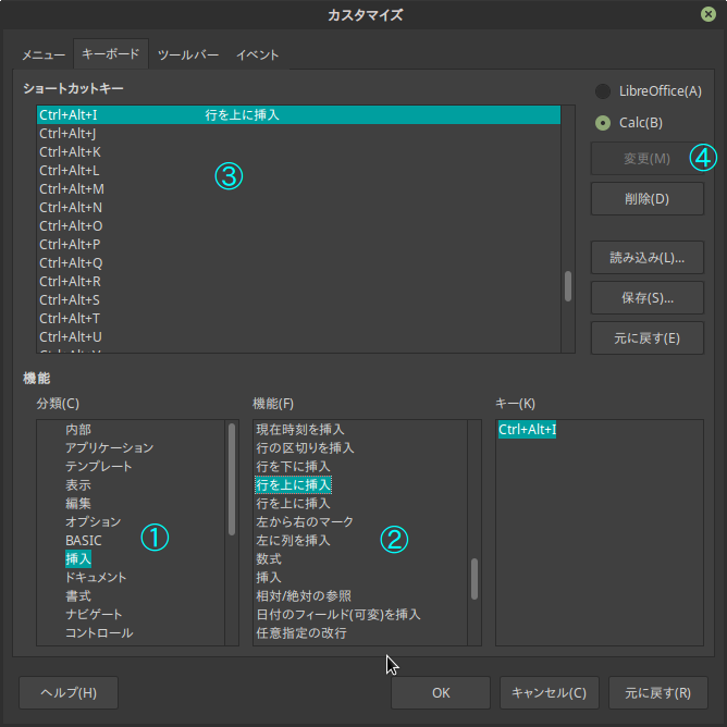 「行を上に挿入」を選び、ショートカットキーを選び、変更ボタンを押す