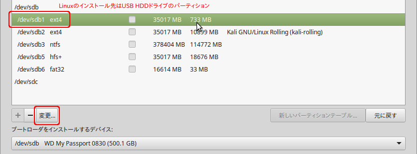 続けてLinuxのインストール先、USB HDDのパーティションを選んで「変更」